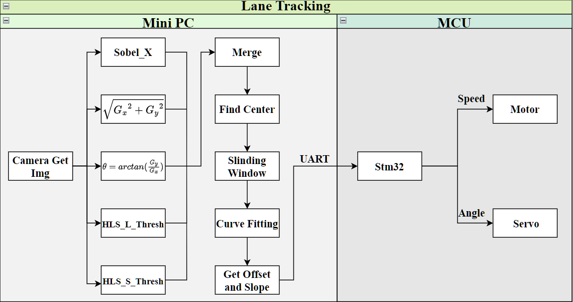 - Obtaining the slope of the lane line and calculating the turn angle of the cart by combining it with the cart’s offset from the center.